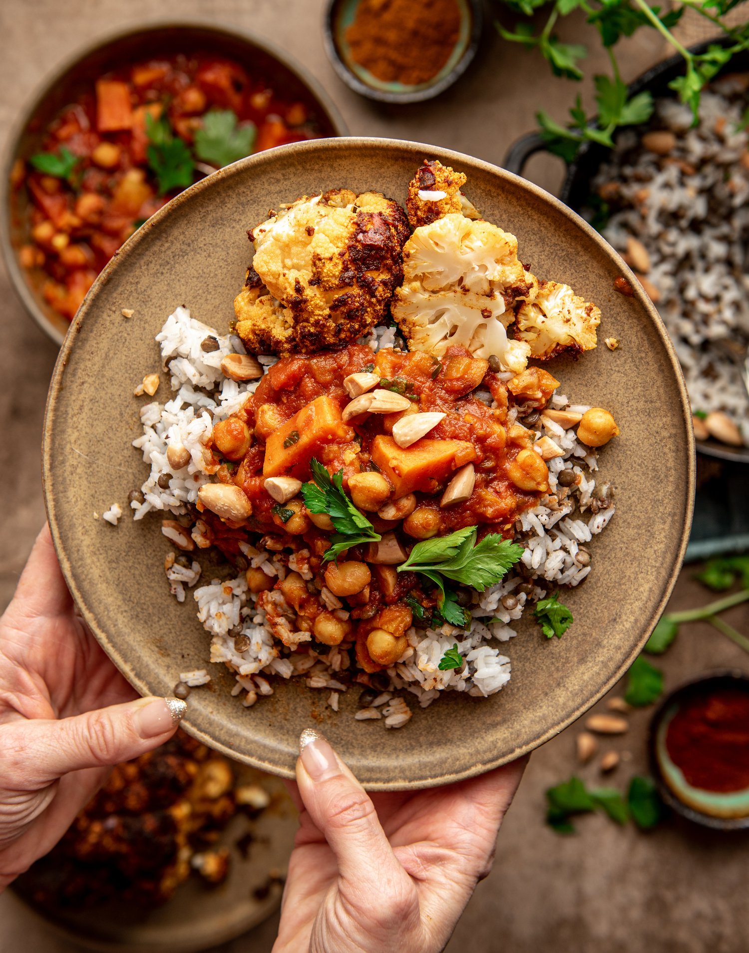 Learn to cook vegetable tagine, zaalouk, taktouka, lentil stew, vegan couscous